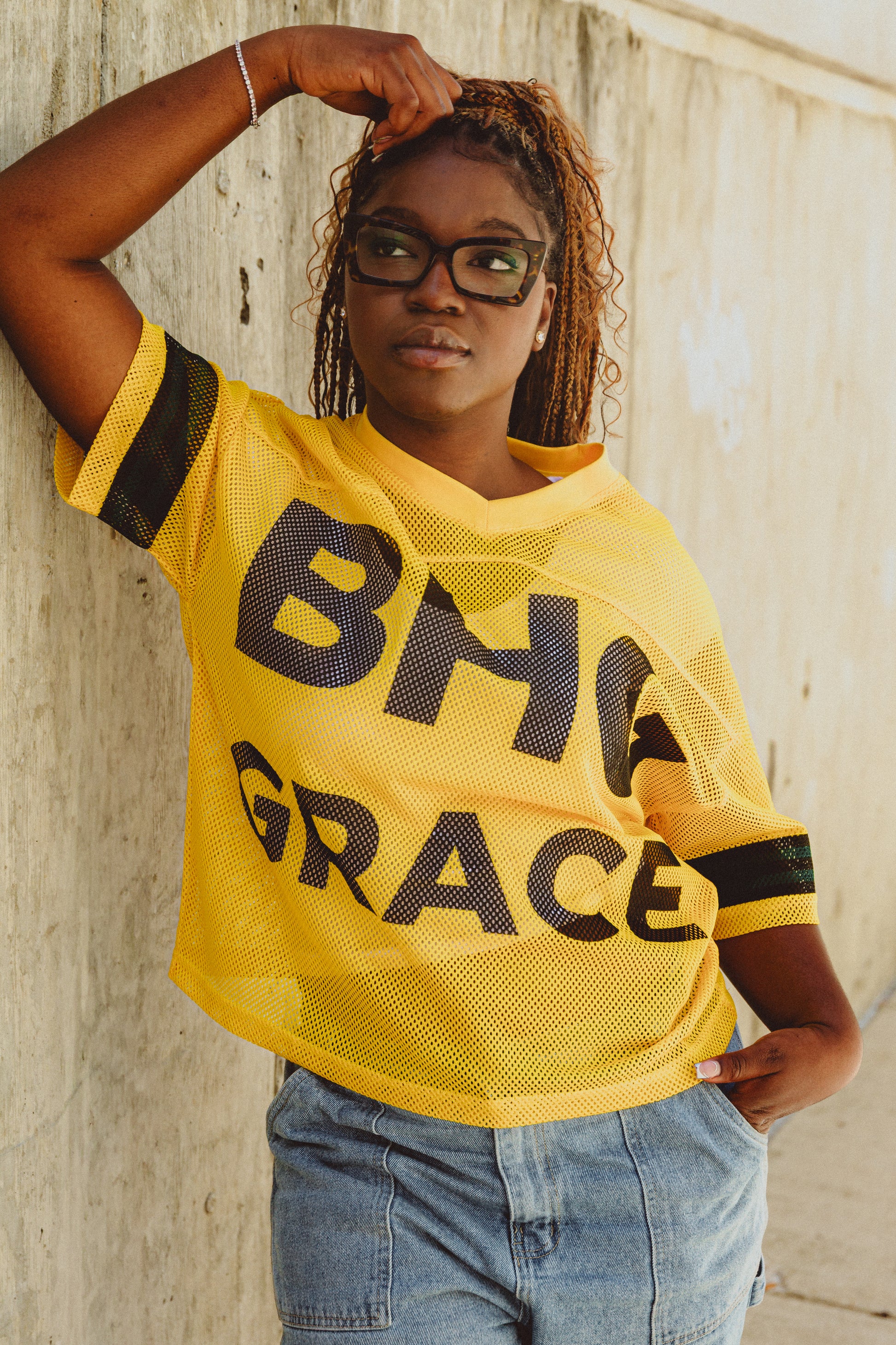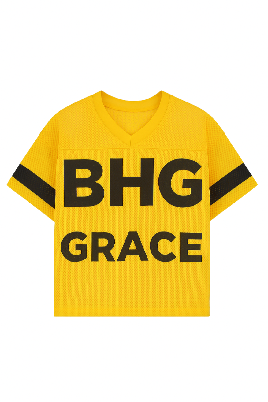 A bold, breathable mesh jersey made for movement and message. Featuring "BHG" and "GRACE" in standout black print, with sporty sleeve stripes and a relaxed fit. Lightweight, comfortable, and designed to wear your faith with confidence.